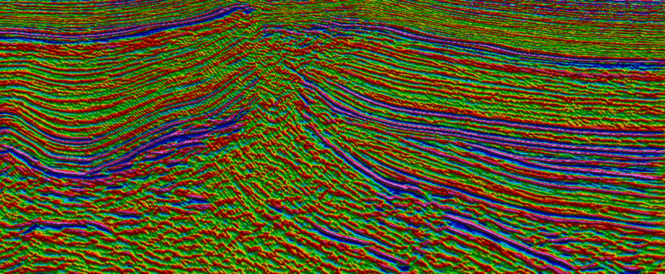 Seismic amplitude of a time slice horizon - color coded